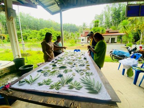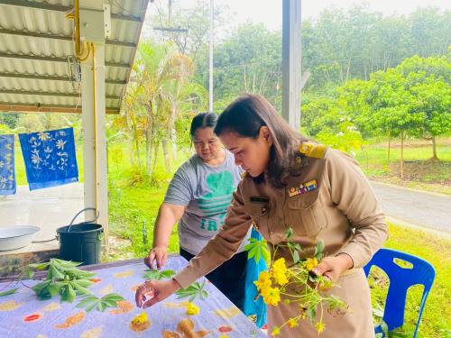 พช.ถ้ำพรรณรา ลงพื้นที่ให้กำลังใจกลุ่มดุสิตพฤกษา ในการทำผ้าพิมพ์ลายด้วยสีธรรมชาติ ECO - PRINT